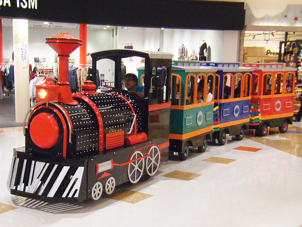 | 【ショッピングセンターでご利用いただいたケース】 上の写真はショッピングセンター内でのイベントの様子です。最小半径以上の広さが確保できればショッピングセンター内でも走行可能です。弊社のロードトレインは精巧にできておりますので、数多くのご家族ロードトレインに乗った後に記念撮影をされていました。 |